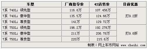 據(jù)4S店銷(xiāo)售人員介紹:目前新7系現(xiàn)車(chē)較少,大部分需要預(yù)訂。最快預(yù)定時(shí)間為2周左右,最長(zhǎng)需等3個(gè)月以上。目前店內(nèi)只有740Li領(lǐng)先型少量現(xiàn)車(chē),,顏色有黑色及灰色。在優(yōu)惠政策方面,740Li系列可以打9.2折,750Li系列可以打9.8折,喜歡的朋友可以到店內(nèi)洽談。