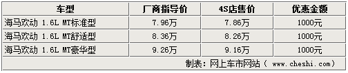 經銷商表示,海馬歡動1.8L排量車型,最低配的手動舒適型售價8.76萬,最高配的自動(CVT)豪華型售價10.66萬,優惠金額均為9千元,除現金優惠外還會有相應的裝飾贈送。現金優惠配合購置稅優惠,則大大減輕了消費者的購車負擔。