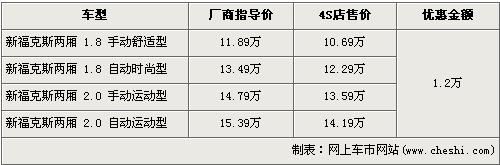 ?怂棺06年8月份上市以來(lái),其憑借動(dòng)感前衛(wèi)的外形以及動(dòng)力充沛的性能配置博得了不少年輕時(shí)尚小齡青年的喜愛(ài),使此車的銷量一直保持的比較穩(wěn)定。上個(gè)月網(wǎng)上車市為您帶來(lái)了兩廂福克斯全系優(yōu)惠1萬(wàn)元的行情,近日據(jù)網(wǎng)上車市價(jià)格監(jiān)測(cè)系統(tǒng)顯示:新?怂箖蓭惮F(xiàn)金優(yōu)惠1.2萬(wàn)元,具體詳情請(qǐng)看下表: