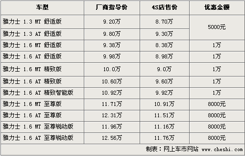 據(jù)4S店銷售人員介紹,目前雅力士全系車型有黑色、紫色等現(xiàn)車供應。因為車型較多,現(xiàn)車主要集中在1.3、1.6舒適版手動和自動擋車型上,其余高配車型均需要預訂,F(xiàn)金優(yōu)惠方面1.3排量兩款車可以優(yōu)惠現(xiàn)金5000元,1.6精致版優(yōu)惠則達到了1萬元,最低售價僅為8.38萬元。至尊版車型優(yōu)惠8000元現(xiàn)金,如果消費者到店的話還將有一部分的優(yōu)惠。