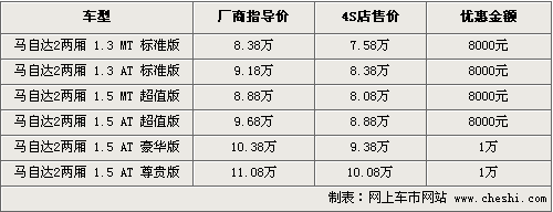 長安馬自達2系列車型在推出后備受關注,尤其兩廂車靈活多變的車身顏色和流線型的外觀非常惹人喜愛,三廂車總體的空間上也能滿足普通家庭出行的需要,是經濟型轎車中的一款精品。目前筆者了解到,馬自達2系列最高優惠幅度已經過萬,具體車型以及價格如下列表: