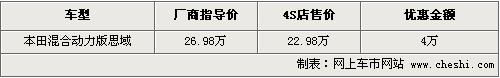 據4s店銷售人員介紹,目前本田混合動力版思域現車可以優惠現金4萬元,廠商指導價格為26.98萬,優惠后售價為22.98萬。各店內供應的現車均為白色款,銷售人員介紹,因為整車是進口引進,顏色只有白色、藍色等為數不多的幾款,進口車的車漆為金屬漆。如果消費者要訂車的話,需要交2萬元訂金,但是具體的交車時間不能確定。