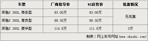 今年的上海車展上,改款奔馳S級與消費者首次見面,據(jù)悉此款新奔馳S級將會在下個月正式上市。隨著新款奔馳S級的即將上市以及寶馬新7系入門級車型730Li的上市,現(xiàn)款在售的奔馳入門級車型S300L的價格會有什么變化呢?據(jù)了解,奔馳S 300L近期出現(xiàn)了最高4萬元的優(yōu)惠,具體價格詳情請看下表: