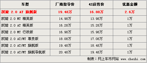 東風(fēng)雪鐵龍凱旋在同級(jí)別車型中性價(jià)比較高,前沿的中控臺(tái)設(shè)計(jì),中央集控式方向盤、EPS+GPS導(dǎo)航等豐富的配置均在凱旋上能夠看到。根據(jù)網(wǎng)上車市價(jià)格檢測(cè)系統(tǒng)顯示,目前個(gè)別商家針對(duì)凱旋推出了特價(jià)車型,優(yōu)惠幅度達(dá)2.6萬(wàn)元,并可以獲得部分禮品,具體車型和價(jià)格如下: