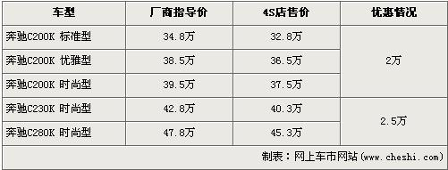 奔馳C級轎車一直就是奔馳里最暢銷的車型,它的總銷量占到了奔馳總銷量的三分之一。目前,國內銷售的奔馳C級轎車是去年新上市的全新C級車型,全系分為C200K、C230和C280三種類別共5款車型,售價區間為34.8萬元-47.8萬元。近日據北京奔馳經銷店銷售人員介紹,目前奔馳C級全系最高優惠2.5萬元,具體詳情請看下表: