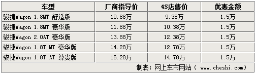 據(jù)銷售人員介紹,雖然兩款增壓版駿捷Wagon車型經(jīng)官方調價,但各店內銷售的駿捷WAGON車型仍可給出1.5萬元的現(xiàn)金優(yōu)惠,還是相當超值的,F(xiàn)階段店內在售的主要為1.8L的手動版車型,而2.0L車型較少,如需購買仍需提前預訂,訂金為5000元,一個月左右的時間即可提車。