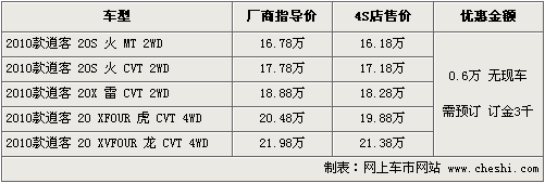 據東風日產4S店銷售人員介紹,目前2010款逍客現車供應仍然很緊張,但近期購買可優惠現金6000元,預訂訂金為3000元,大概1個月左右時間可以提到現車。另據介紹,逍客在未來幾個月時間里將推出新款車型,在外觀方面的變化較大,新款車型線條更加流暢。