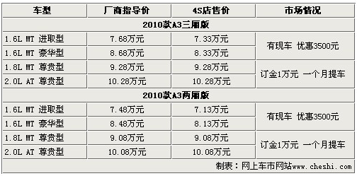 據奇瑞汽車4S店銷售人員介紹,2010款奇瑞A3上市之后的反響要比老款車型更高,在三種排量中,廣大消費者對1.6L車型的關注度略高與其他車型。目前4S店內1.6L兩種車型的現車比較充足,購車可以享受3500元的現金優惠。1.8L和2.0L車型暫時沒有現車,如想購買可以預訂,訂金為10000元,預計提車時間為一個月左右。