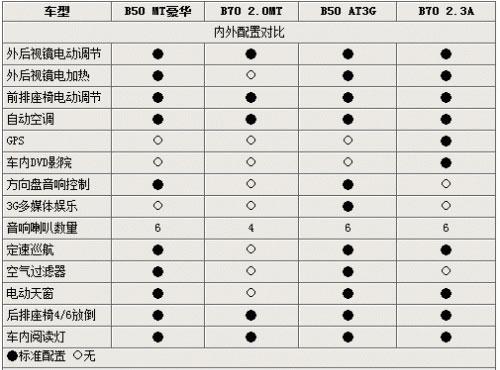 通過此項的對比,可以發現兩款兄弟車型在外觀以及內部的絕大多數配置均極為近似,僅僅是在高配車型之上有了一些不同的豪華系統,如B70 2.3AT豪華車型上的GPS以及DVD系統,還有B50 AT3G版之上的多媒體娛樂系統等等。而B50全息均配備了定速巡航系統,也是新車的一大亮點。