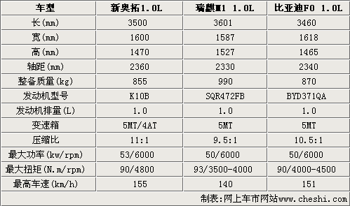 新奧拓、瑞麒M1和比亞迪F0都搭載了1.0L發(fā)動(dòng)機(jī),其中只有新奧拓有望匹配4速自動(dòng)變速箱,而且新奧拓的壓縮比達(dá)到11:1,動(dòng)力性能更加強(qiáng)勁。瑞麒M1和比亞迪F0的最大功率數(shù)值比較接近,雖然略差于新奧拓,但低速高扭的特性也使其能適應(yīng)更多的路況。新奧拓的整備質(zhì)量只有855kg,比瑞麒M1和比亞迪F0都輕,這也是影響整車動(dòng)力性能的重要因素。從詳細(xì)數(shù)據(jù)來(lái)看,新奧拓的最高時(shí)速可以達(dá)到155km/h,而瑞麒M1只能達(dá)到140km/h,兩款車的差距可以從整備質(zhì)量上看的出原因。
