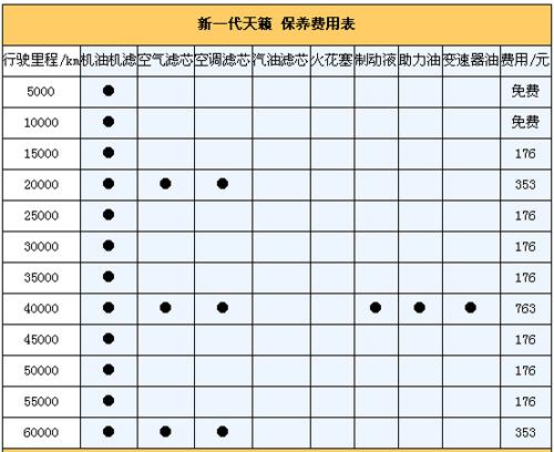 5.保養費。我們向東風日產4S店售后服務人員咨詢過,新一代天籟保養周期為5000km,首保在5000km時進行(免費),以后每5000km做一次保養,以一年2萬公里來計算其一年保養費平均用在900元。