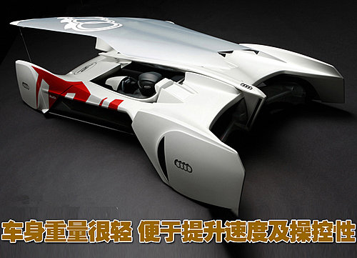一個小型太陽能飛艇將會輔助奧迪這款概念車,為駕駛員提供路況信息,此外這個小型飛艇還配置攝像頭以及傳感器,目的是讓駕駛員能夠了解該車該車的速度以及整體車輛的性能狀況。與之同時,為了進一步提升該車的速度及操控性能,該車的車身重量也最大限度的有所降低。