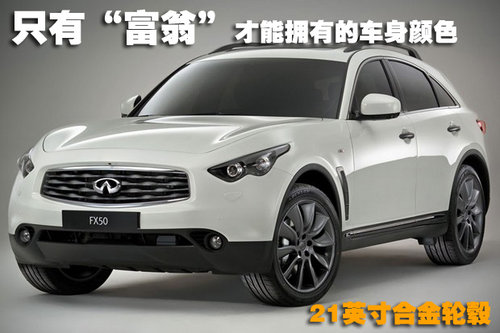 英菲尼迪FX“百萬富翁版”以F50S運動版為基礎開發而成,這款車型僅有獨特的月光白與曜石黑色兩種專屬的車身顏色可供選擇。灰色的21英寸“渦輪”造型輕合金輪轂是整車造型的亮點,更顯霸氣。