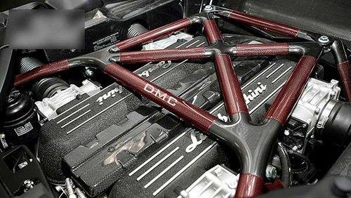 打開背部的引擎蓋,可以發現一個印有DMC字樣的紅色碳纖加強架,在加強架下的V12引擎經過重新DMC的ECU刷寫后,馬力提升至670匹的水平。經過測速,這臺Quattro Veloce在0-96的加速時間只需3.2秒,可見Murcielago強大的改裝潛力。