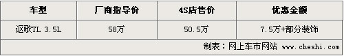 09新款的謳歌TL在去年12月份正式進入國內(nèi)市場銷售,相比之前老款車型,09款在外觀、性能、排量上均有不同程度的提升。目前這款車可以優(yōu)惠現(xiàn)金7.5萬元,同時還有部分裝飾贈送,具體行情如下: