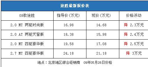 近期國(guó)內(nèi)市場(chǎng)SUV車(chē)型再次升溫,4月份銷(xiāo)量較上月有大幅增加,其中途勝4月份銷(xiāo)量高達(dá)4050輛,排在SUV銷(xiāo)量榜第四位。我們從北京地區(qū)的一家北京現(xiàn)代綜合經(jīng)銷(xiāo)商處了解到,09款途勝全系車(chē)型的優(yōu)惠在2.3-3萬(wàn)元區(qū)間,價(jià)格和三月初基本相同,只有2.7手動(dòng)四驅(qū)豪華型的價(jià)格比月初下降了2000元,優(yōu)惠金額增加到了3萬(wàn)元。以下是09款途勝最新詳細(xì)報(bào)價(jià)表: