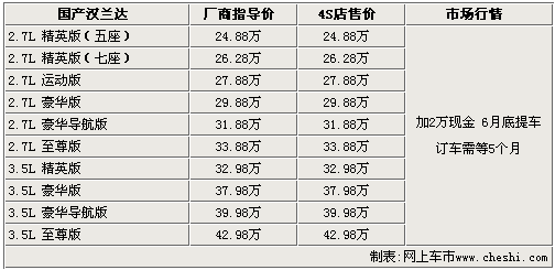 2009年5月25日,廣州豐田正式推出了SUV車型漢蘭達,售價24.88—42.98萬元。作為一款日系經典SUV車型,這款車以進口方式銷售時就得到了廣大消費者的喜愛,此次國產后的漢蘭達增加了2.7升排量的車型,不僅使車系的價格較進口車型降低不少,而且還增加了消費者的選擇空間。目前國產漢蘭達的現車還沒有到店,急于提車的消費者需要加價提車。