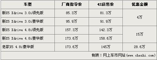 寶馬全新X5于去年7月上市,此車的上市為競爭激烈的高性能運(yùn)動型多功能車(SAV)細(xì)分市場再次在操縱靈活性方面制定起新的標(biāo)準(zhǔn)。全新寶馬共有3.0L及4.8L兩個排量選擇,價格區(qū)間為83.7萬元-173.6萬元。近日根據(jù)網(wǎng)上車市價格檢測系統(tǒng)顯示:寶馬X5全系最高優(yōu)惠金額達(dá)28.6萬元,具體詳情請看下表: