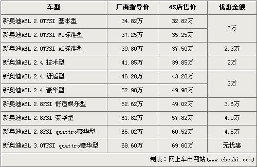 在奧迪家族中,A6L是非常重要的一款商務(wù)車型,新款?yuàn)W迪A6L通過外觀和安全等方面的改款升級,在同級別車型中擁有了更高的性價(jià)比,入門級車型價(jià)格更能夠比拼寶馬5系等對手。根據(jù)網(wǎng)上車市價(jià)格監(jiān)測系統(tǒng)顯示,目前A6L最高優(yōu)惠達(dá)到了4.5萬元,具體行情如下: