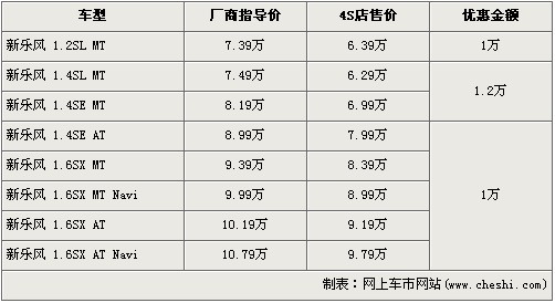 新樂風(fēng)是雪佛蘭旗下的三廂入門級(jí)家用車銷售主力,但由于上市多年,消費(fèi)者對(duì)于它也產(chǎn)生了審美疲勞。在今年的5月份,帶有家族新特征的小改款新樂風(fēng)來到世人眼前,外觀的改進(jìn)讓此車動(dòng)感不少。近日據(jù)網(wǎng)上車市價(jià)格系統(tǒng)檢測(cè)顯示,新樂風(fēng)出現(xiàn)了最高1.2萬元的優(yōu)惠,具體價(jià)格詳情請(qǐng)看下表: