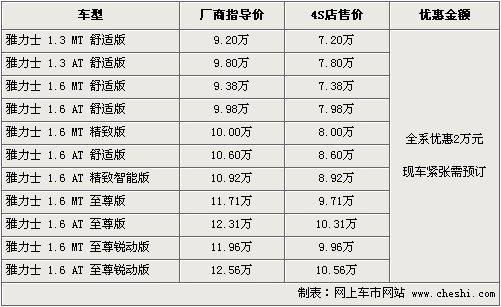 雅力士在歐洲是一款非常受歡迎的A0級小車,但在08年進入國內(nèi)銷售后,其銷量并不樂觀,但是從這款車的配置、安全性方面,仍然是一款值得購買的小車。根據(jù)網(wǎng)上車市價格監(jiān)測系統(tǒng)顯示,目前雅力士銷售比較火爆,現(xiàn)車緊缺,近期購買雅力士全系車型可以優(yōu)惠2萬元。具體行情如下: