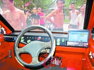 車前的大燈和轉向燈,車后的剎車燈和倒車雷達和正規(guī)的小轎車幾乎沒兩樣,4個車門雖然還沒有裝玻璃,但是門和門框結合密實。車內前面只有一個駕駛座,駕駛座左手邊是有5個擋位的擋桿,后面是一個可折疊的并排兩座位。一個從“五菱”車上淘來的方向盤控制車的轉向,方向盤后是平整的控制臺,上面按了大燈、倒車雷達、散熱風扇和電子打火等不同顏色的按鈕,最讓人驚嘆的是,在操控臺兩邊還安裝了一個可自動伸縮的DVD播放系統(tǒng)。