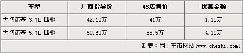 據經銷商銷售人員介紹,目前Jeep大切諾基全系最高優惠4.19萬元。大切諾基共分為3.7和5.7兩個排量,3.7L車型經1.19萬元的優惠后,售價從42.19萬元下降到了41萬元;而排量更大的5.7L車型經4.19萬優惠后,售價從56.69萬元下降到了55.5萬元。