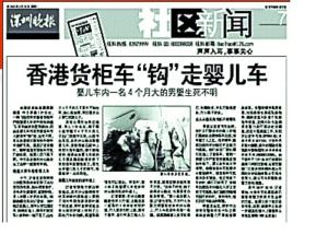 ●4月25日,深圳市龍崗區南灣街道發生一宗貨柜車拖掛嬰兒車肇事逃逸案件。被拖嬰兒下落不明,生死難料。