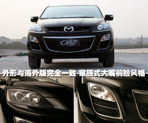 前臉采用了馬自達新一代大嘴設計,較大的進氣格柵以及更加突出的車標。前保險杠中的鍍鉻邊框使CX-7更加時尚與運動,黑底大燈內采用遠近光分體設計,近光裝備了透鏡氙燈。