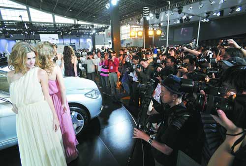 網友“午夜鐘聲”正在奔馳展位上尋找著最合適的拍攝位置,“去年奔馳展位上的洋車模最為出彩,今天肯定要來看一看。”他9點就來到車展主會場,帶著全套攝影裝備,一個小時收獲了300多張照片,“回去整理好就貼我的博客上去。”他興沖沖地說。