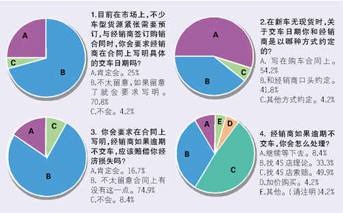 在調(diào)查中,有75%的消費(fèi)者表示不會(huì)細(xì)看汽車購銷合同,不會(huì)留意到經(jīng)銷商有沒有在合同上寫明具體的交車日期,比例相當(dāng)之高,相比之下,只有25%的消費(fèi)者表示在買車時(shí)會(huì)認(rèn)真地看汽車購銷合同,并肯定會(huì)要求經(jīng)銷商在合同上寫明具體的交車日期,比例并不高。