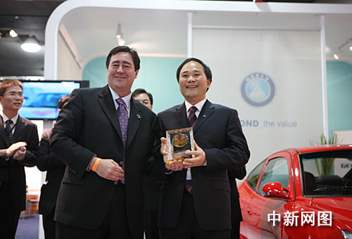 中新網(wǎng)1月16日電 當?shù)貢r間1月14日下午,2008底特律車展組委會主席卡爾•加里亞拉來到吉利展臺,將本次展會一份非常特殊的大獎授予吉利集團董事長李書福,表彰他多年來領導吉利汽車不斷進取、不斷進步所取得的非凡成就。