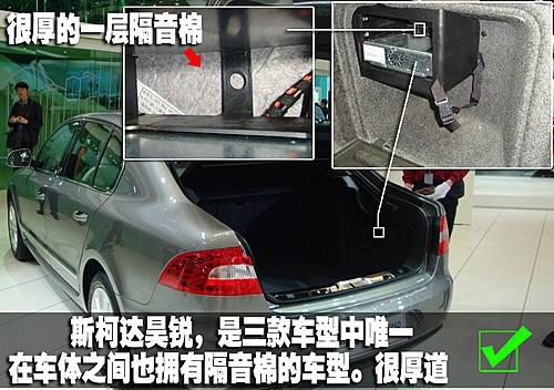 打開行李箱后我們通常可以在一些“隱蔽”的地方發(fā)現(xiàn)一臺車的細節(jié)做工,例如這部分對比中您將看到斯柯達-昊銳在三款車型中獨有的“車輛內(nèi)側(cè)隔音棉”。