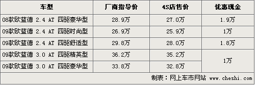 歐藍德是三菱引入國內銷售的中型SUV車型,經過09款小改款后,新款在外觀上增加了冷銀色換擋裝飾板,鍍鉻門內把手,鍍鉻側窗裝飾物,鍍鉻尾門裝飾條等等,同時內飾也有局部的變動和提升。根據網上車市價格監測系統顯示,目前歐藍德新老款車的優惠幅度均在2萬元內,具體車型以及價格如下:
