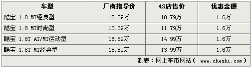 據(jù)4S店銷售人員介紹,此次酷寶系列車型涉及系列內(nèi)各款車型,1.8L手動(dòng)時(shí)尚型及1.8T自動(dòng)版運(yùn)動(dòng)型車型的現(xiàn)車各店最高可給出16000元的現(xiàn)金優(yōu)惠。而1.8T系列車型部分顏色需要訂購,優(yōu)惠幅度同樣可達(dá)到1.6萬元;操控效果極佳的手動(dòng)擋1.8L車型現(xiàn)車充足,享受優(yōu)惠的同時(shí)還可由經(jīng)銷商處添置價(jià)值近千元的車身裝飾,但不能折換現(xiàn)金。