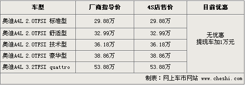 筆者從北京地區(qū)經(jīng)銷商處了解到,目前奧迪A4L現(xiàn)車供應比較緊張,現(xiàn)車數(shù)量非常少,款式主要集中在2.0T舒適版和3.2兩款車,各4S店供車情況有一定差異。部分店提現(xiàn)車仍然需要加1萬元現(xiàn)金,或者在店內(nèi)做1萬元裝飾。消費者如果訂車的話,需要交5000元左右訂金,等待一個月時間提車。