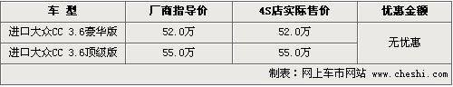 自去年廣州車展大眾CC亮相后,它的車型以及售價(jià)一直備受關(guān)注,同時(shí)這款車搭載的6速DSG雙離合變速箱以及四輪驅(qū)動(dòng)系統(tǒng)均成為其關(guān)注亮點(diǎn)。目前筆者從進(jìn)口大眾北京地區(qū)經(jīng)銷商處了解到,進(jìn)口大眾CC現(xiàn)車已經(jīng)到店,并有多種顏色可選,具體車型以及價(jià)格如下: