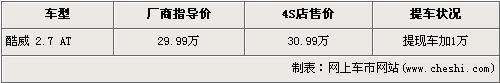 據4S店銷售人員介紹,在售的道奇酷威為2.7L自動檔車型,售價為29.9萬元。近期購買酷威的消費者如要在經銷店提現車,需在廠商指導價29.9萬元的基礎上加價1萬元才可提車。銷售人員還介紹,近期購買酷威的車主還可以享受到3年或8萬公里的超長質保政策。