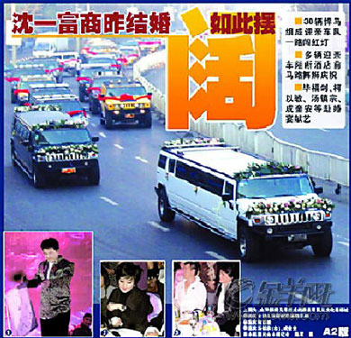 片斷回放:11月24日上午7時許,沈陽市鐵西區(qū)沈遼中路西部汽配城路段,一個自西向東行駛的車隊迎面駛來,一輛豐田霸道越野車(錄像車)行駛在車隊前面,隨后是一白一黑兩輛加長悍馬越野車,再往后就是并排行駛的悍馬越野車和豐田霸道。這些車的前后車牌都貼上了“百年好合”字樣,擋住了車牌號。悍馬打著雙閃一路向東,甚至連紅燈都毫不理會一闖而過。這場婚禮由中央電視臺主持人畢福劍主持,包括柯以敏、成奎安、湯鎮(zhèn)宗等在內的明星紛紛登臺獻藝。