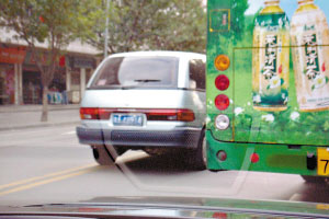 按照交通規(guī)則,馬路上的雙黃實(shí)線,車輛行駛既不能壓線,更不能跨越。在天河岑村附近的這條長(zhǎng)興路,雙向四車道卻頻頻有車輛視中央的雙黃實(shí)線為無(wú)物。圖中左邊這輛廣州車牌的MPV,僅僅因?yàn)橄忧胺降墓卉囆旭偺谑切募钡貜淖蠓綁褐p黃實(shí)線超越前方的公交車。記者在現(xiàn)場(chǎng)看見,這輛車在超越中途,半個(gè)車身甚至越到了對(duì)面車道,影響相向車輛的行駛,相當(dāng)危險(xiǎn)。(鄧?yán)?
