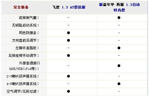 對應飛度1.3MT手動型的是新嘉年華1.3MT時尚型,兩者價格相差3900元,新嘉年華以一項主要的被動安全配置出——即前排側氣囊。此外,還多出了外接音頻接口和兩個揚聲器,少了方向盤前后調節、后排座椅角度可調以及花粉過濾。