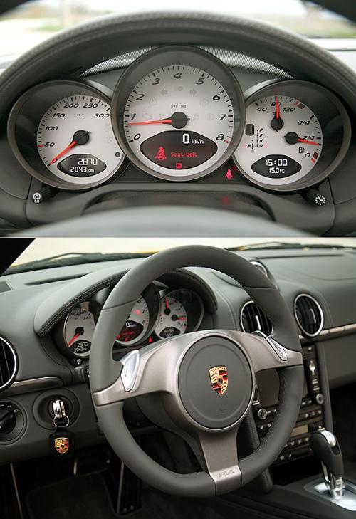 不同于911經典的5環表,Boxster采向3環的設計,搭配液晶面板,提供豐富的行車信息,配合PDK的搭載,儀表中亦出現檔位顯示器。而不變的置中式轉速表以及左側鑰匙點火開關,則是保時捷品牌的堅持。