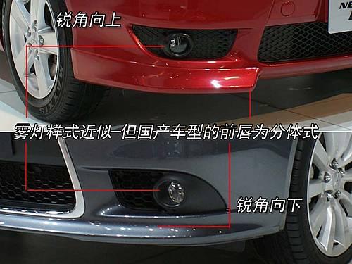 霧燈周邊的設計有所不同,塑料的燈罩邊緣的銳角設計位置兩車截然相反,但是霧燈的材質(zhì)以及照明方式未變。國產(chǎn)版藍瑟的前唇為分體樣式,進口車為更完整化的一體樣式。