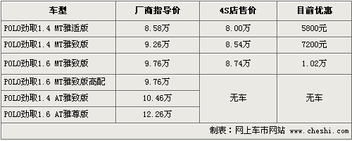 據(jù)銷售人員介紹,目前POLO勁情全系優(yōu)惠幅度從3900元-6000元不等,優(yōu)惠后售價從8.19萬-10.56萬元。同時,近期推出的POLO運動款也受到消費者喜愛,據(jù)銷售介紹,現(xiàn)車到店即買。運動款主要有藍(lán)色、黑色以及白色。目前POLO勁情以及運動版均已沒有現(xiàn)車供應(yīng),需預(yù)定,訂金為1萬,一個月時間才能提車。