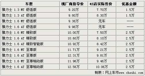 據(jù)4S店銷售人員介紹,目前廣州豐田各4S店內(nèi)雅力士1.3L現(xiàn)車較少,而1.6排量的車型就相對比較充足,并可提供試乘試駕服務(wù),消費者可在展廳內(nèi)近距離接觸展車、親身體驗試駕車后直接購買現(xiàn)車。銷售人員表示,現(xiàn)在到店購買雅力士的消費者可享受到最高達(dá)2.5萬的價格優(yōu)惠,還可得到商家贈送的簡單裝飾等。