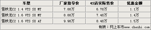 目前北京地區(qū)4S店主要賣的是C2運動版VTS車型,購車的消費者不僅可以享受到最高1.5萬元的現(xiàn)金優(yōu)惠,而且還能得到商家隨車贈送的部分車內(nèi)裝飾。目前C2運動版VTS主要有紅色、黑色等款,顏色和車型并不是很全,個別款需要預(yù)訂,其余車型均沒有現(xiàn)車銷售。