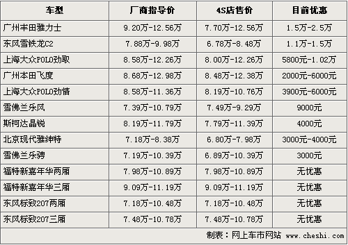 隨著石油價格逐步上漲,小排量車逐漸受到消費者親睞。為了爭得市場,各汽車品牌推出的1.6L以內(nèi)AO級車型數(shù)量和款式越來越多,競爭也隨之加劇。以下我們總結(jié)的13款A(yù)O級車型價格均在7萬-13萬之間,排量覆蓋了1.2、1.3、1.4、1.5和1.6五個區(qū)間,可供選擇的空間非常大,而價格優(yōu)惠從2000元-2.5萬元不等,在消費者購車時既可以享受小排量購置稅的優(yōu)惠政策,也可以得到4S店的降價優(yōu)惠,既省車錢,又能少花油錢。具體車型以及價格優(yōu)惠參考如下: