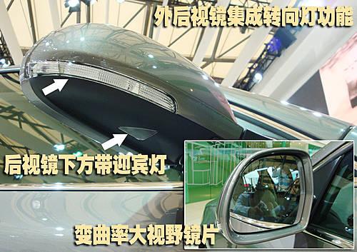 位于兩側外后視鏡的設計融合了時下高端車型的諸多元素,例如帶有側面轉向燈功能以及可以在夜晚照亮車門下方的迎賓燈功能,變曲率的大視野后視鏡在車內的觀察效果非常好。