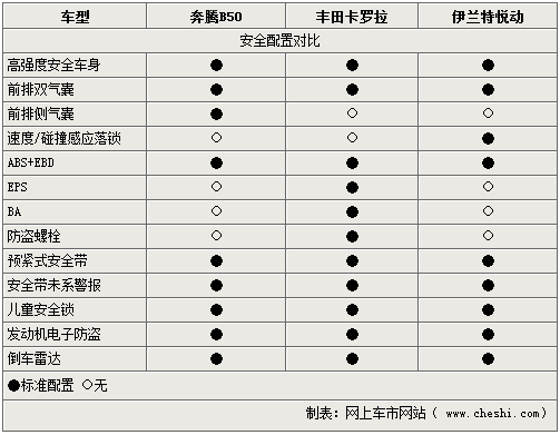在安全裝備上,奔騰B50五款車型采用的是同樣的配置,前排雙氣囊、駕駛員自動預緊安全帶、駕駛員安全帶未系報警等都為標配,防炫目內(nèi)后視鏡、后門兒童鎖、間歇式寬幅雨刷都為保障駕駛安全設計。對比另外兩款車型則少了EPS以及BA等輔助安全系統(tǒng)。