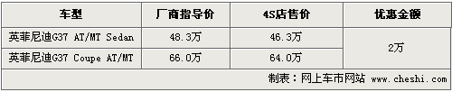 筆者從英菲尼迪北京地區經銷商處了解到,目前英菲尼迪G37銷售的車型包括四門版和兩門版車型,售價為48.3萬和66萬。現在消費者購車的話可以優惠2萬元的現金,優惠后售價為46.3萬元。這款車有銀色、黑色、紅色、白色/藍色等可提供給消費者選擇,購車的消費者可到店具體咨詢。